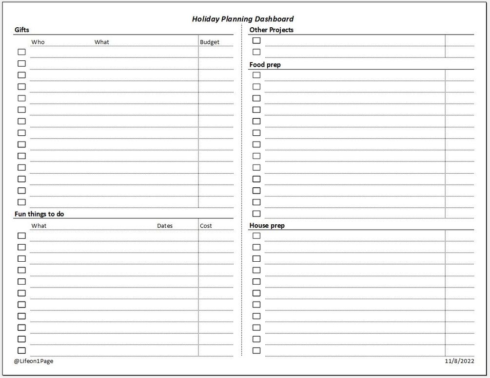 The Holiday Planning Dashboard is a simple tool to keep track of holiday tasks in an easy to read single page format.
